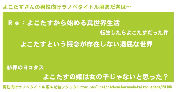 | 女子向けラノベタイトル風あだ名 | 『異世界で失敗しない100のよこたす』 |