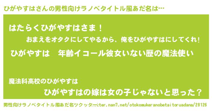 | 女子向けラノベタイトル風あだ名 | 『ひがやすはの玉の輿計画!』 |