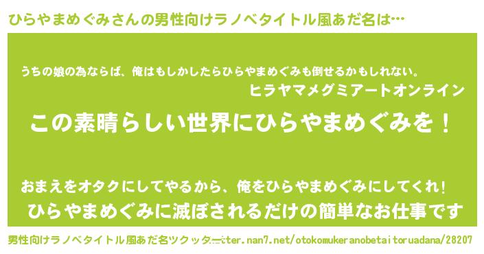 | 女子向けラノベタイトル風あだ名 | 『悪役ひらやまめぐみに転生したようですが、知った事ではありません』 |
