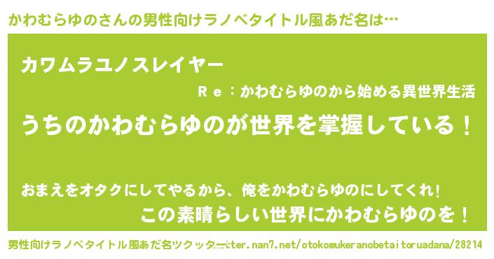 | 胡散臭い通販商品みたいなあだ名 | 『あなたにだけ特別に提供する限定10本のレアな日本酒…その名も「かわむらゆの」』 |