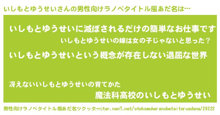 | 女子向けラノベタイトル風あだ名 | 『異世界で失敗しない100のいしもとゆうせい』 |