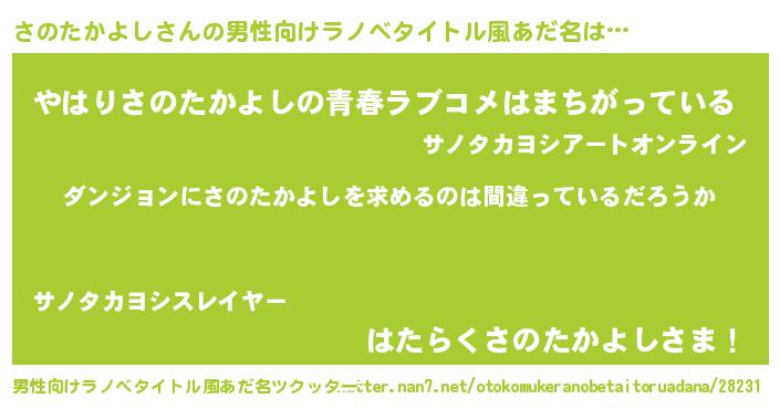 | 女子向けラノベタイトル風あだ名 | 『さのたかよしの卵を拾いまして』 |