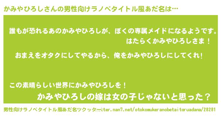 | 女子向けラノベタイトル風あだ名 | 『かみやひろし夫妻のなれそめ』 |