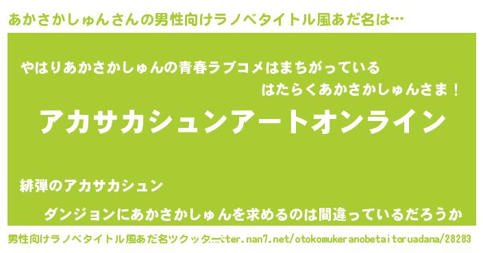 | 女子向けラノベタイトル風あだ名 | 『あかさかしゅん姫と円卓の騎士』 |