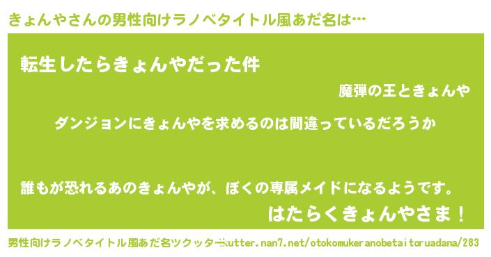 | 女子向けラノベタイトル風あだ名 | 『きょんやの卵を拾いまして』 |