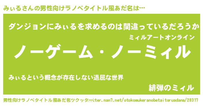 | 女子向けラノベタイトル風あだ名 | 『死神みぃるの再婚』『みぃるの契約王妃』 |