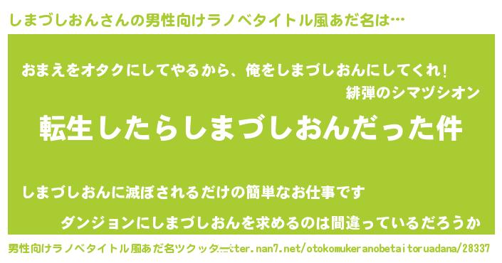 | 女子向けラノベタイトル風あだ名 | 『婚約破棄系悪役しまづしおんに転生したので、保身に走りました。』 |