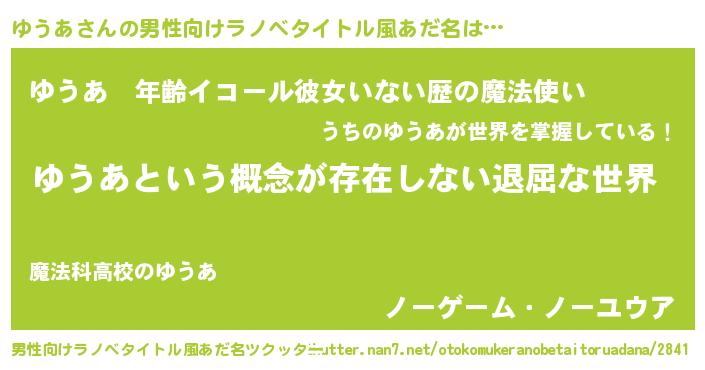 | 女子向けラノベタイトル風あだ名 | 『異世界で失敗しない100のゆうあ』 |