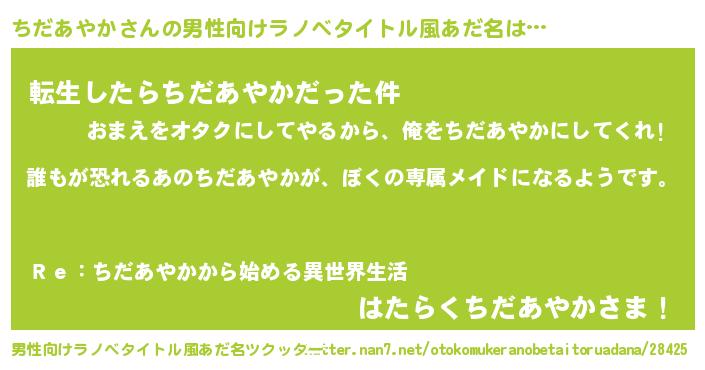 | 女子向けラノベタイトル風あだ名 | 『異世界でカフェちだあやかを開店しました。』 |