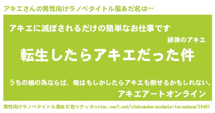 | 女子向けラノベタイトル風あだ名 | 『アキエの玉の輿計画!』 |