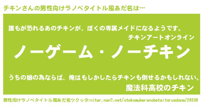 | 女子向けラノベタイトル風あだ名 | 『チキン恋絵巻』『チキン姫と円卓の騎士』 |