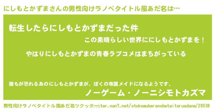 | 女子向けラノベタイトル風あだ名 | 『にしもとかずま伯爵の花嫁』 |