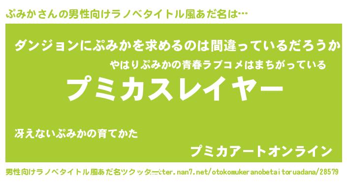 | 胡散臭い通販商品みたいなあだ名 | 『信頼と実績のサプリメント…その名も「ぷみか」』 |