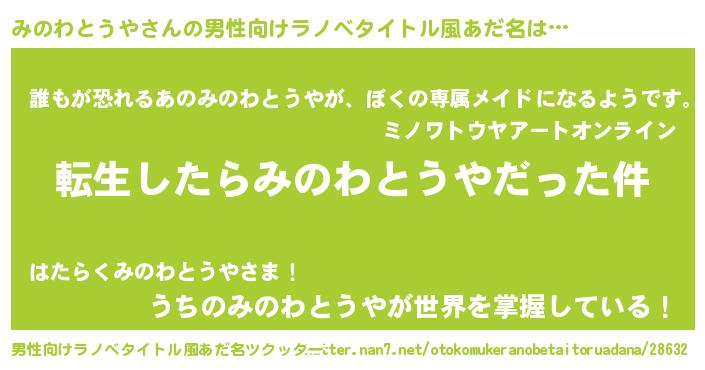 | 女子向けラノベタイトル風あだ名 | 『みのわとうやの玉の輿計画!』 |