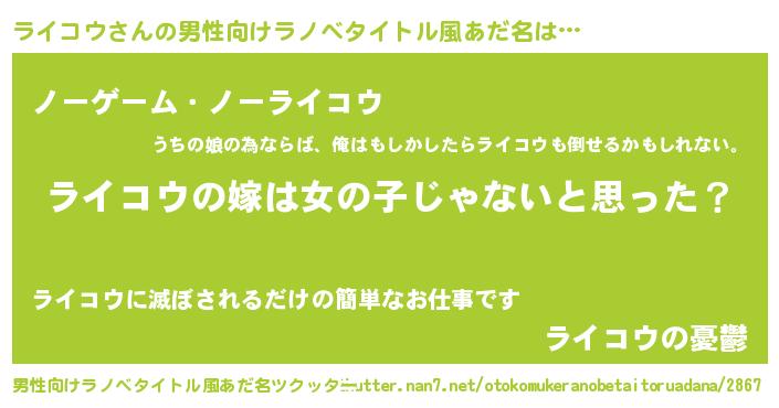 | 女子向けラノベタイトル風あだ名 | 『ライコウ様がみてる』『ライコウ恋絵巻』 |