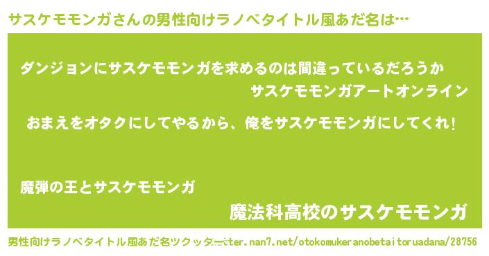 | 女子向けラノベタイトル風あだ名 | 『サスケモモンガ夫妻のなれそめ』 |