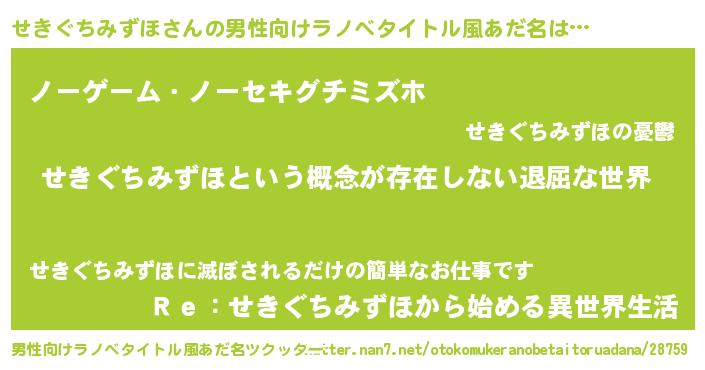 | 胡散臭い通販商品みたいなあだ名 | 『絶対に幸福をもたらす健康食品…その名も「せきぐちみずほ」』 |