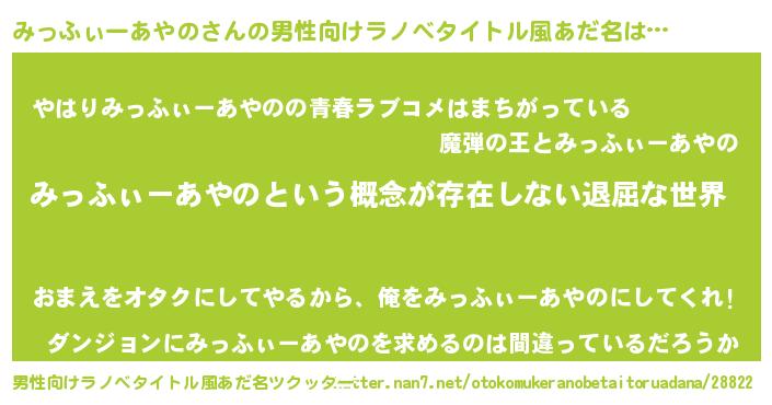 | 胡散臭い通販商品みたいなあだ名 | 『絶対に幸福をもたらす健康食品…その名も「みっふぃーあやの」』 |