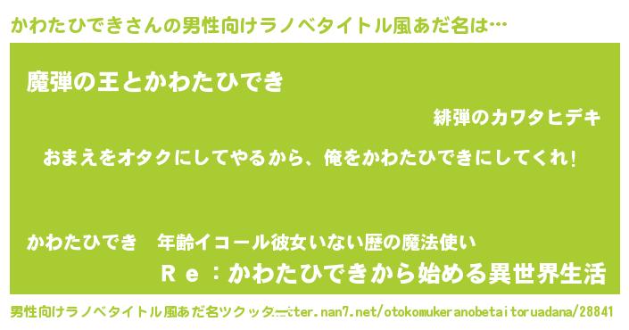 | 女子向けラノベタイトル風あだ名 | 『かわたひでき夫妻のなれそめ』 |