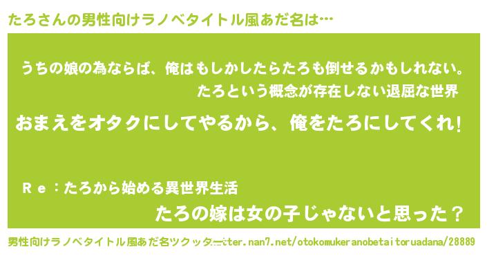 | 女子向けラノベタイトル風あだ名 | 『たろ夫妻のなれそめ』『たろの婚約者』 |