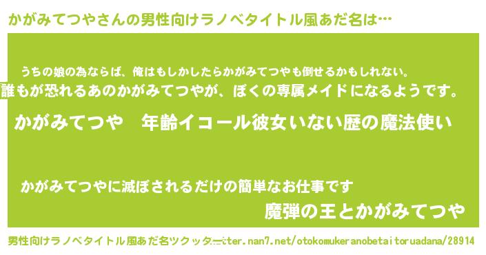 | 女子向けラノベタイトル風あだ名 | 『かがみてつやの玉の輿計画!』 |