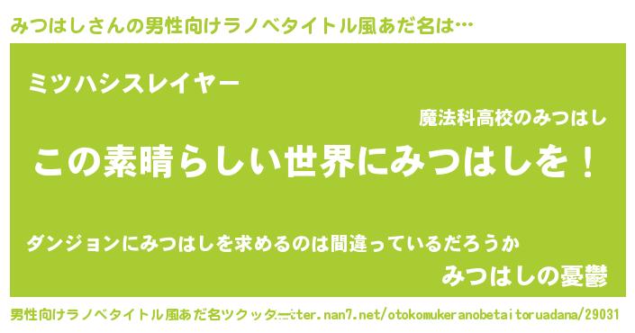 | 女子向けラノベタイトル風あだ名 | 『乙女ゲームの破滅フラグしかない悪役みつはしに転生してしまった…』 |