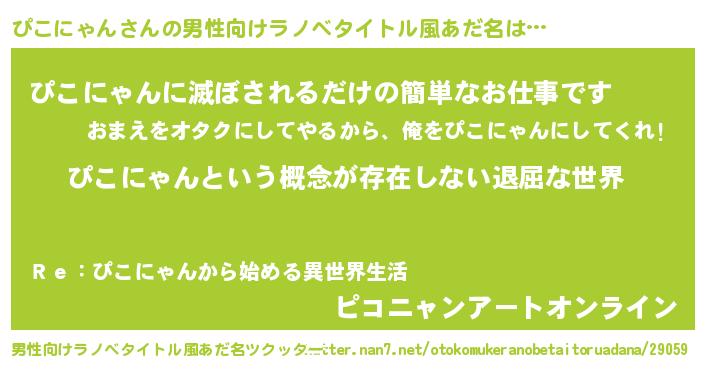 | 女子向けラノベタイトル風あだ名 | 『異世界で失敗しない100のぴこにゃん』 |