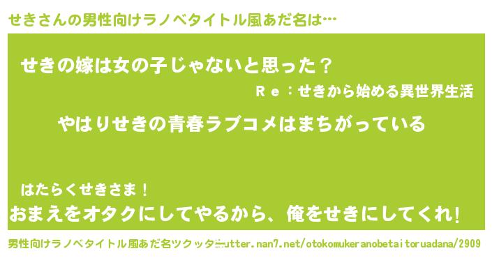 | 女子向けラノベタイトル風あだ名 | 『せきの雑貨屋さん』『せき様がみてる』 |