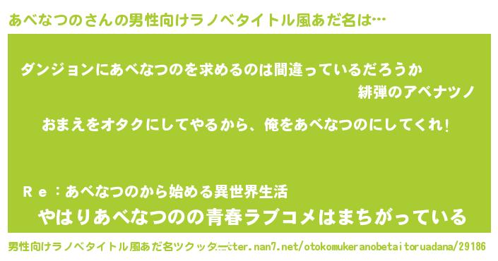| 女子向けラノベタイトル風あだ名 | 『あべなつの夫妻のなれそめ』 |