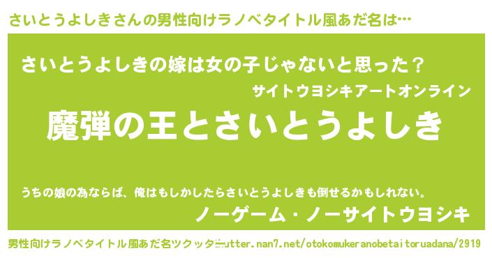 | 女子向けラノベタイトル風あだ名 | 『さいとうよしきが死なない童話 林檎のさいとうよしきの診療簿』 |