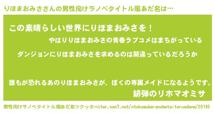 | 女子向けラノベタイトル風あだ名 | 『りほまおみさは平凡を望む』 |