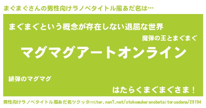 | 女子向けラノベタイトル風あだ名 | 『まぐまぐ姫と円卓の騎士』 |