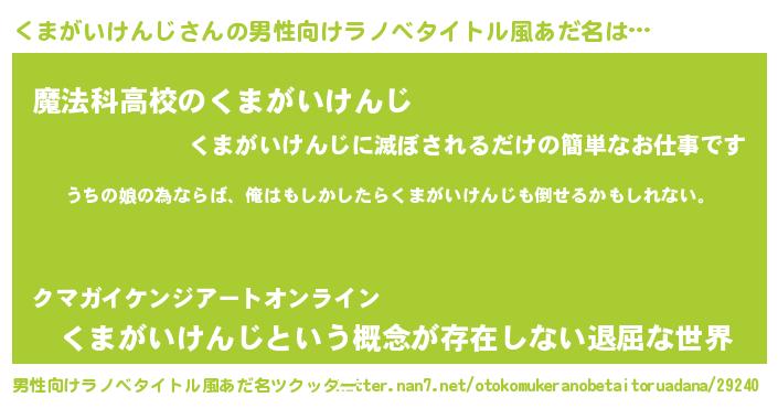 | 女子向けラノベタイトル風あだ名 | 『くまがいけんじ伯爵の花嫁』 |