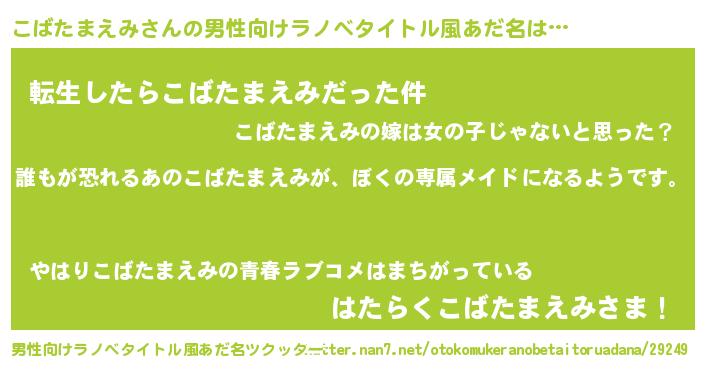 | 胡散臭い通販商品みたいなあだ名 | 『前代未聞の健康食品…その名も「こばたまえみ」』 |
