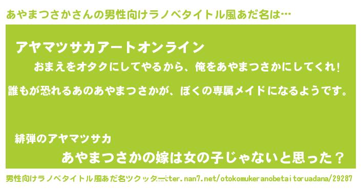 | 女子向けラノベタイトル風あだ名 | 『異世界でカフェあやまつさかを開店しました。』 |