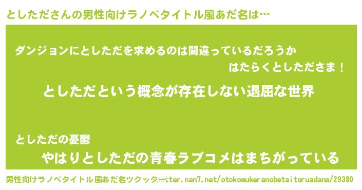 | 女子向けラノベタイトル風あだ名 | 『異世界で失敗しない100のとしただ』 |