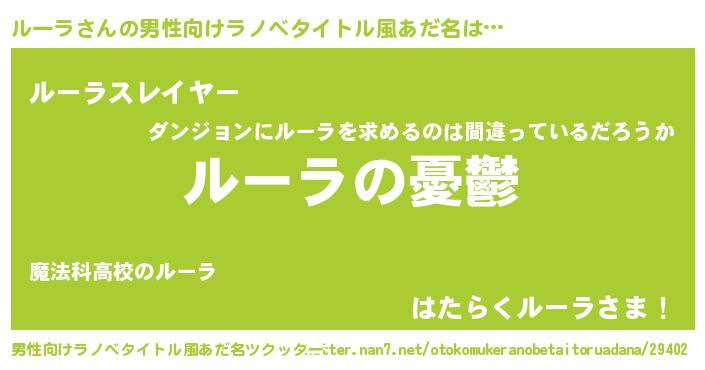 | 女子向けラノベタイトル風あだ名 | 『(仮)ルーラのやんごとなき事情』 |