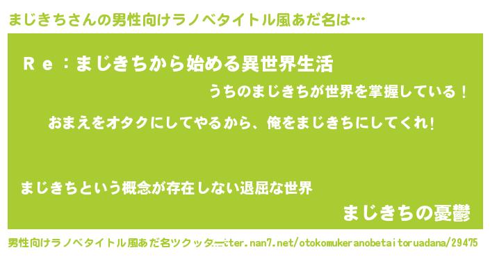| 女子向けラノベタイトル風あだ名 | 『まじきち夫妻のなれそめ』 |