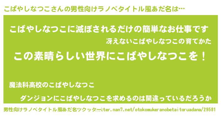 | 胡散臭い通販商品みたいなあだ名 | 『あなたにだけ特別に提供する100年もののヴィンテージワイン…その名も「こばやしなつこ」』 |