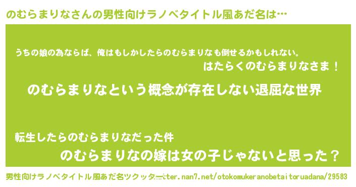 | 女子向けラノベタイトル風あだ名 | 『のむらまりなの契約王妃』 |