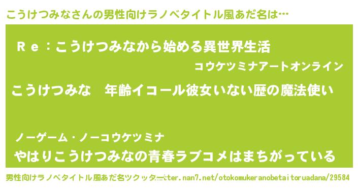 | 女子向けラノベタイトル風あだ名 | 『こうけつみなの玉の輿計画!』 |