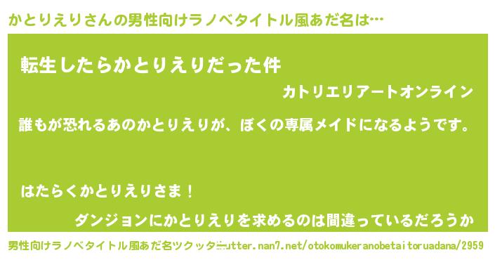 | 女子向けラノベタイトル風あだ名 | 『異世界でカフェかとりえりを開店しました。』 |