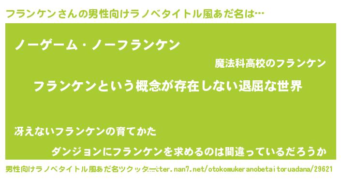 | 胡散臭い通販商品みたいなあだ名 | 『絶対に幸福をもたらす水素水…その名も「フランケン」』 |