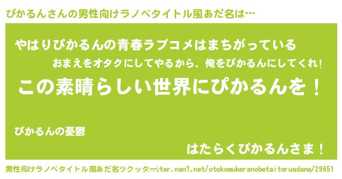 | 女子向けラノベタイトル風あだ名 | 『悪役ぴかるんに転生したようですが、知った事ではありません』 |