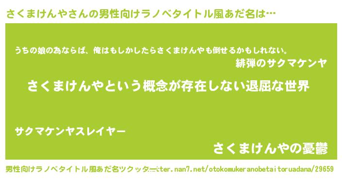 | 女子向けラノベタイトル風あだ名 | 『異世界で失敗しない100のさくまけんや』 |