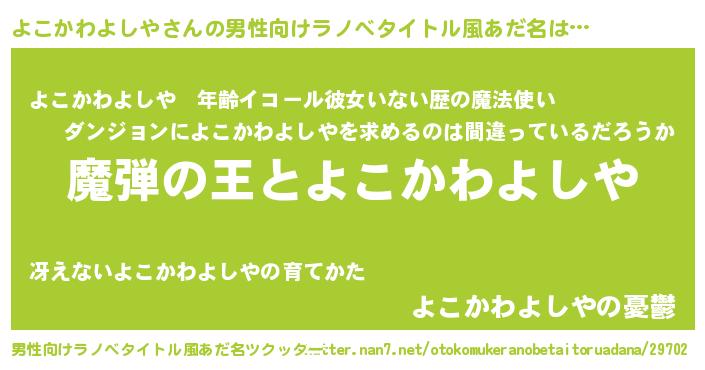 | 女子向けラノベタイトル風あだ名 | 『よこかわよしやが死なない童話 林檎のよこかわよしやの診療簿』 |