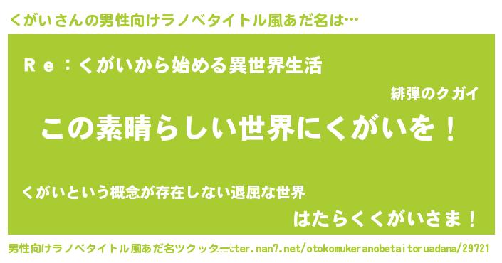 | 胡散臭い通販商品みたいなあだ名 | 『あなたにだけ特別に提供する100年もののヴィンテージワイン…その名も「くがい」』 |
