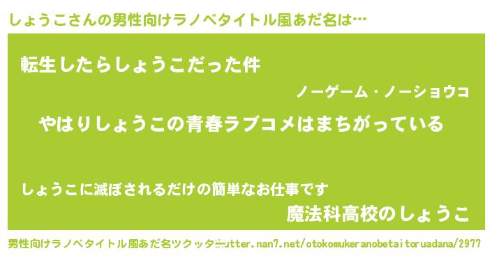 | 女子向けラノベタイトル風あだ名 | 『しょうこ伯爵の花嫁』『しょうこ恋絵巻』 |