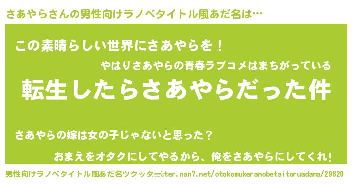 | 胡散臭い通販商品みたいなあだ名 | 『世界中を虜にした世界で10本だけ現存している希少なブランデー…その名も「さあやら」』 |