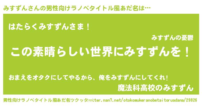 | 女子向けラノベタイトル風あだ名 | 『乙女ゲームの破滅フラグしかない悪役みすずんに転生してしまった…』 |
